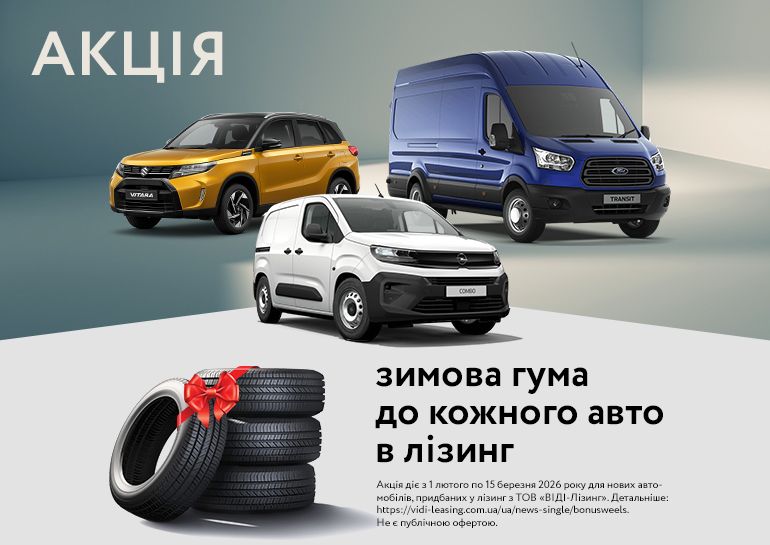 *Акція діє з 1 лютого по 15 березня 2026 року  та застосовується виключно до нових автомобілів, придбаних у лізинг з ТОВ «ВІДІ-Лізинг» за програмами оперативного або фінансового лізингу. Акція не поширюється на автомобілі брендів Land Rover, Lexus, Volvo та не сумується з іншими акційними чи спеціальними умовами імпортерів або дилерських центрів. Під «комплектом зимових шин у подарунок» мається на увазі передача комплекту шин на спеціальних умовах у межах акції. ТОВ «ВІДІ-Лізинг» залишає за собою право змінювати умови акції без попереднього повідомлення. Не є публічною офертою.